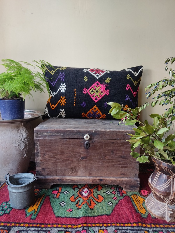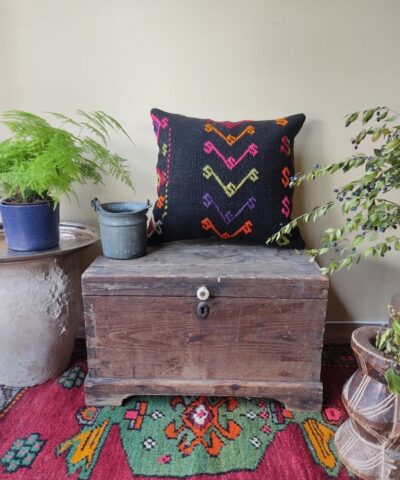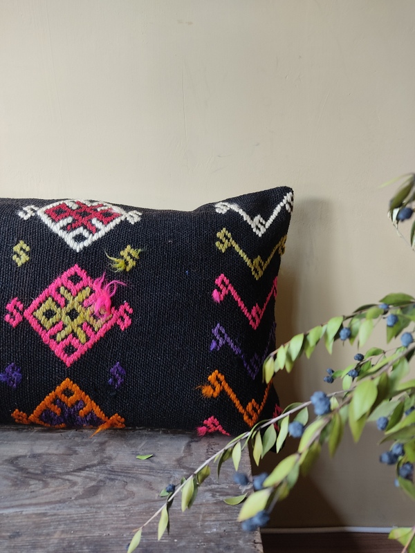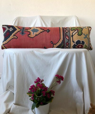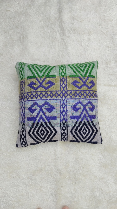 El dokuma kilimden, usta bir işçilikle dikilmiştir. Arkası pamuklu kumaştır ve gizli fermuarlıdır.