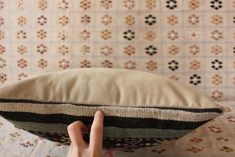 El dokuma kilimden, usta ellerde özenle dikilmiştir. Arkası pamuklu keten kumaş, gizli fermuarlı. Her bir kırlent sadece kılıf olarak gönderilmektedir.
