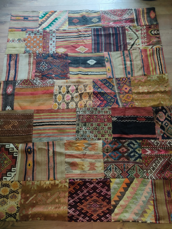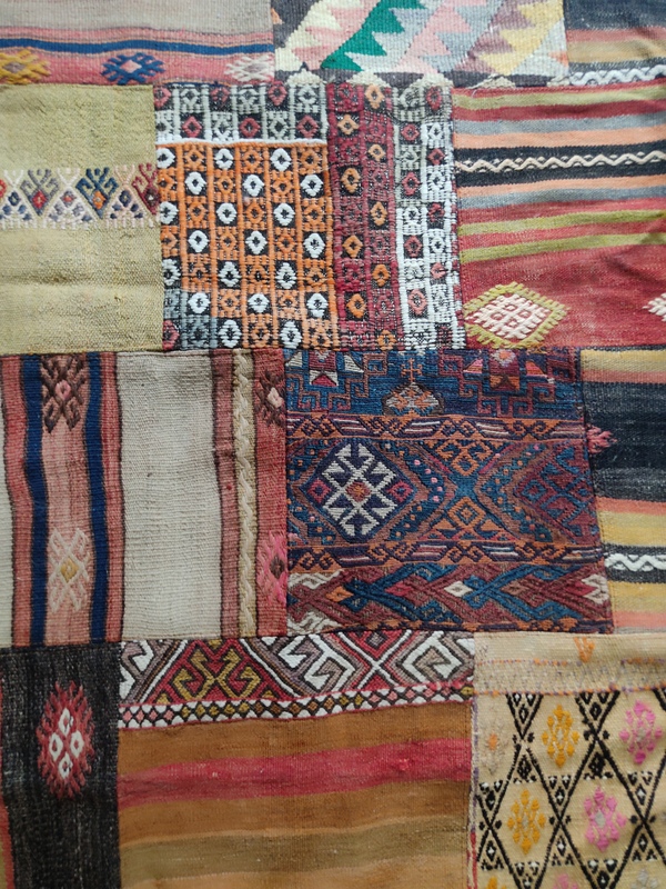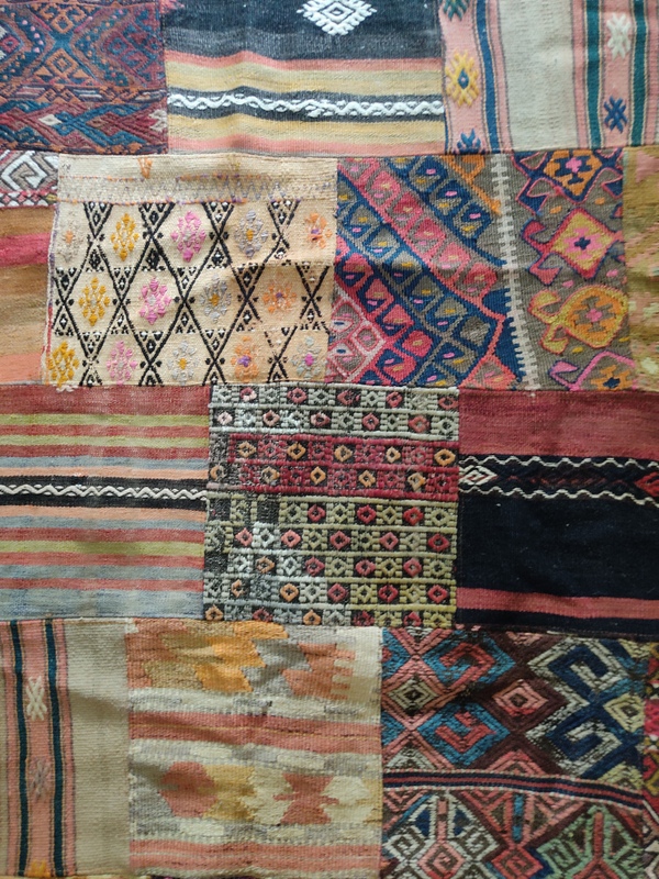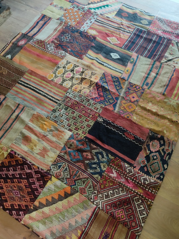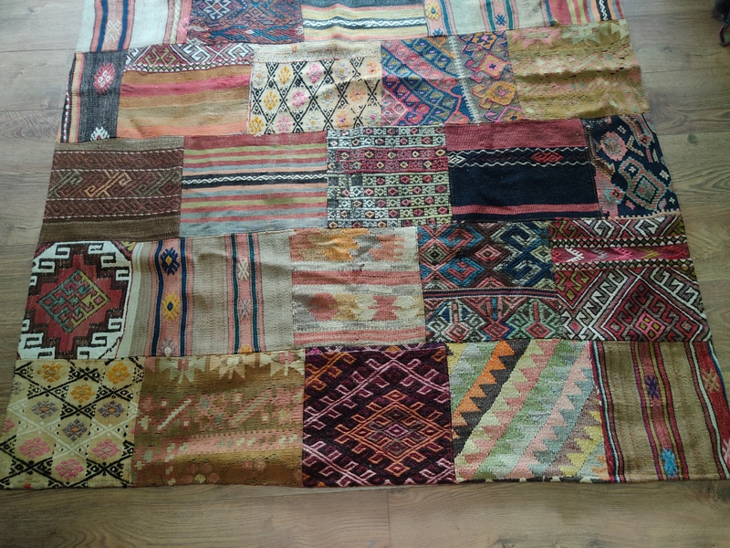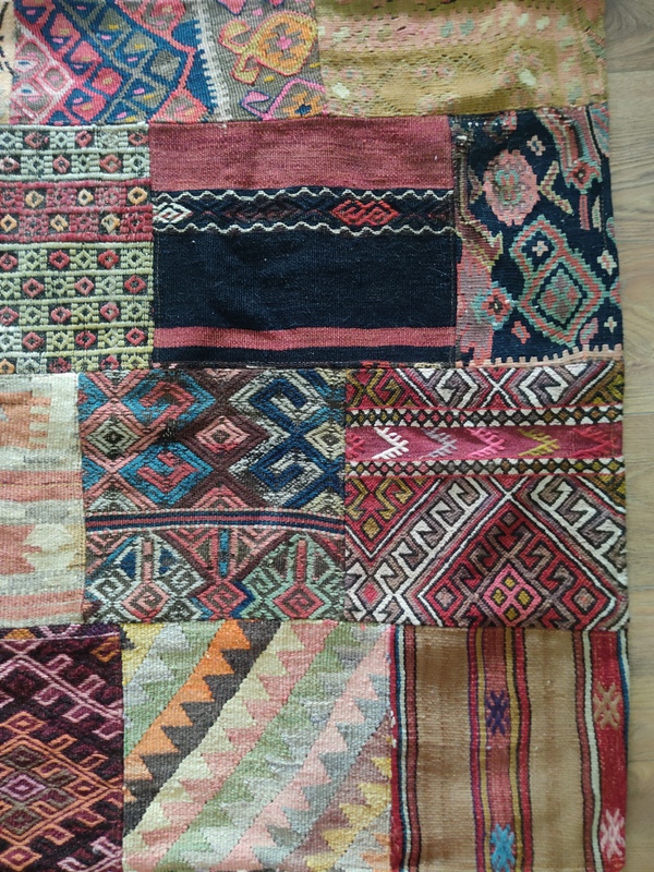 Teknik: El dokuma kilim parçaları usta bir işçilikle birleştirilmiştir. Altı pamuklu kumaş ile astarlanmıştır. Kalın olmasından mütevellit kışın halı yerine kullanabilirsiniz.