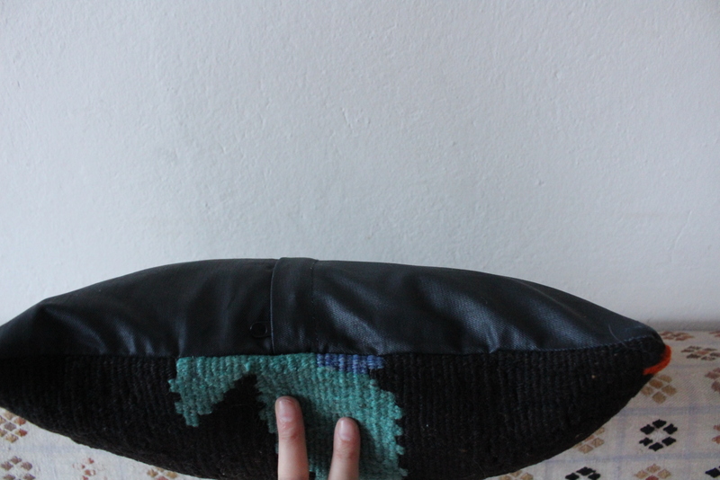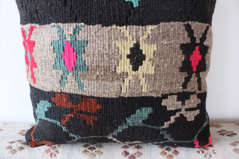 El dokuma kilimden, usta ellerde özenle dikilmiştir. Arkası pamuklu keten kumaş, gizli fermuarlı. Her bir kırlent sadece kılıf olarak gönderilmektedir.