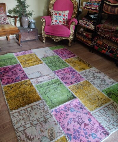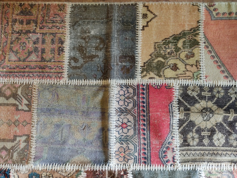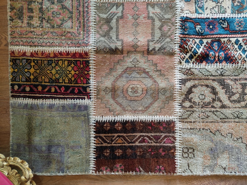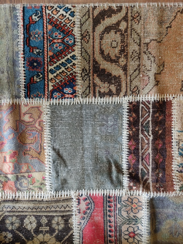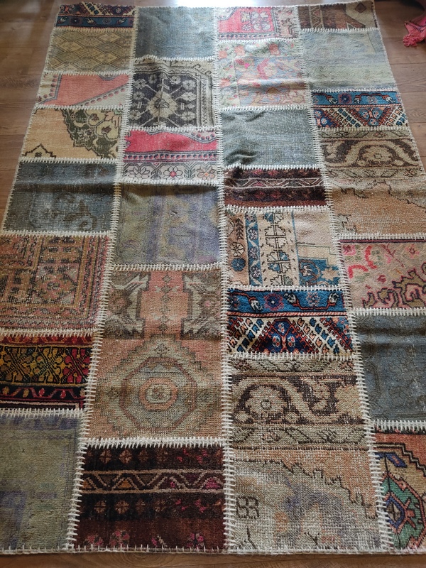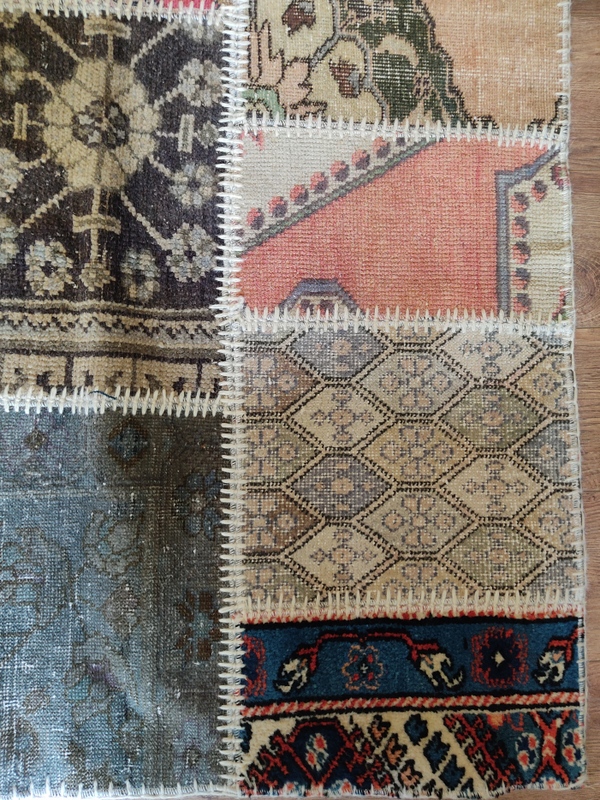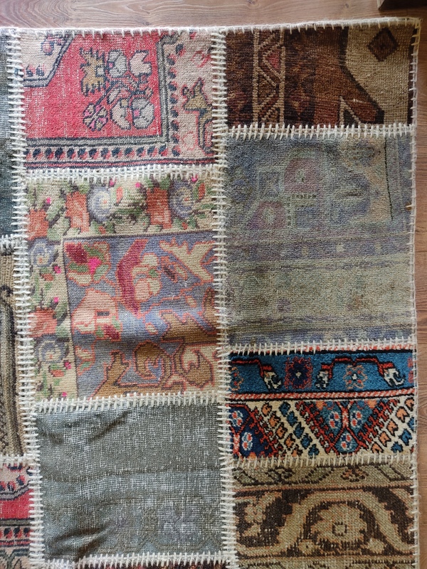 Yıkanmış, tıraşlanmış, overlokla çevrilmiş bir çok halı parçasının usta bir işçilikle bir araya getirilmesi ile oluşturulmuş, zengin görünümüyle bulunduğu alana prestij kazandıracak güçlü bir halı.