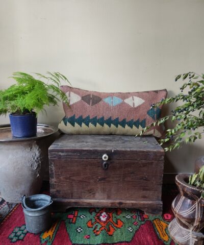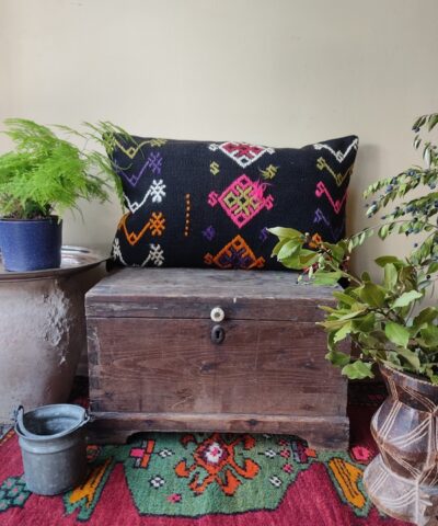 El dokuma kilimden, usta bir işçilikle dikilmiştir. Arkası pamuklu kumaştır ve gizli fermuarlıdır.
