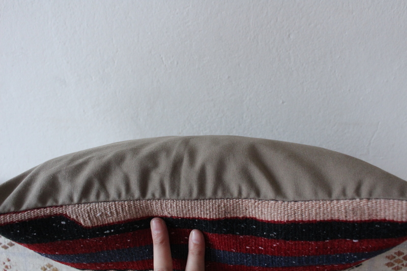 El dokuma kilimden, usta ellerde özenle dikilmiştir. Arkası pamuklu keten kumaş, gizli fermuarlı. Her bir kırlent sadece kılıf olarak gönderilmektedir.