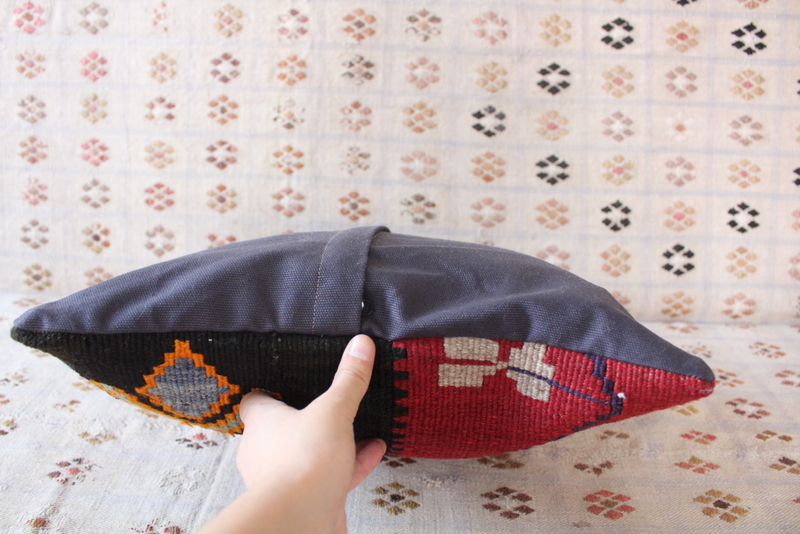 El dokuma kilimden, usta ellerde özenle dikilmiştir. Arkası pamuklu keten kumaş, gizli fermuarlı. Her bir kırlent sadece kılıf olarak gönderilmektedir.
