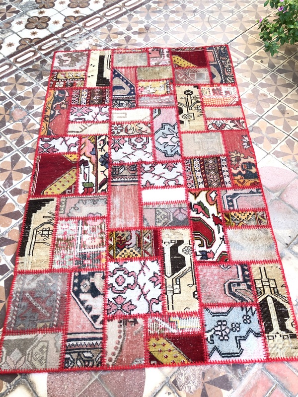 Kırmızılarla çerçevelenmiş, vintage halı parçalarından oluşturulmuş şık, modern ve dinamik bir halı.